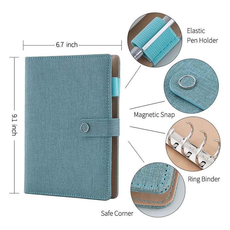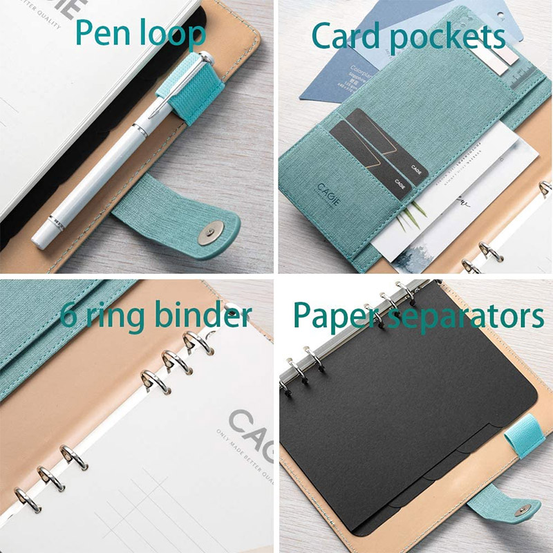 UNIQUE DESIGN : The notebook comes with several card pockets which can be used to store your business card,ID card,Bank card,VIP card or tickets and photos.Calender make you smart and efficient in daily life and work; 6 Ring Binder is used to fix the inner page, just press the small button up and down freely; Pen Holder can hold the pen firmly, fast and easy! Magnetic Button has a strong enough magnetic force to wrap the whole book, perfect ! Hardcover book for extra writing support